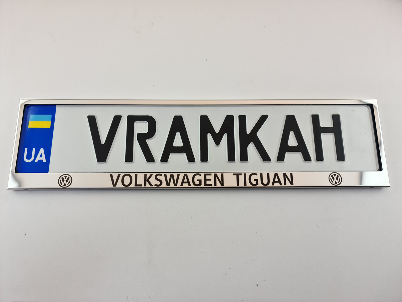 Чорний напис Volkswagen Tiguan та логотипи Volkswagen наноситься на рамку лазерним гравіюванням, стійкою до природних впливів. Напис Volkswagen Tiguan і логотипи Volkswagen не змивається і не стирається. Метал не прорізається, тому напис зроблений фірмовим шрифтом.