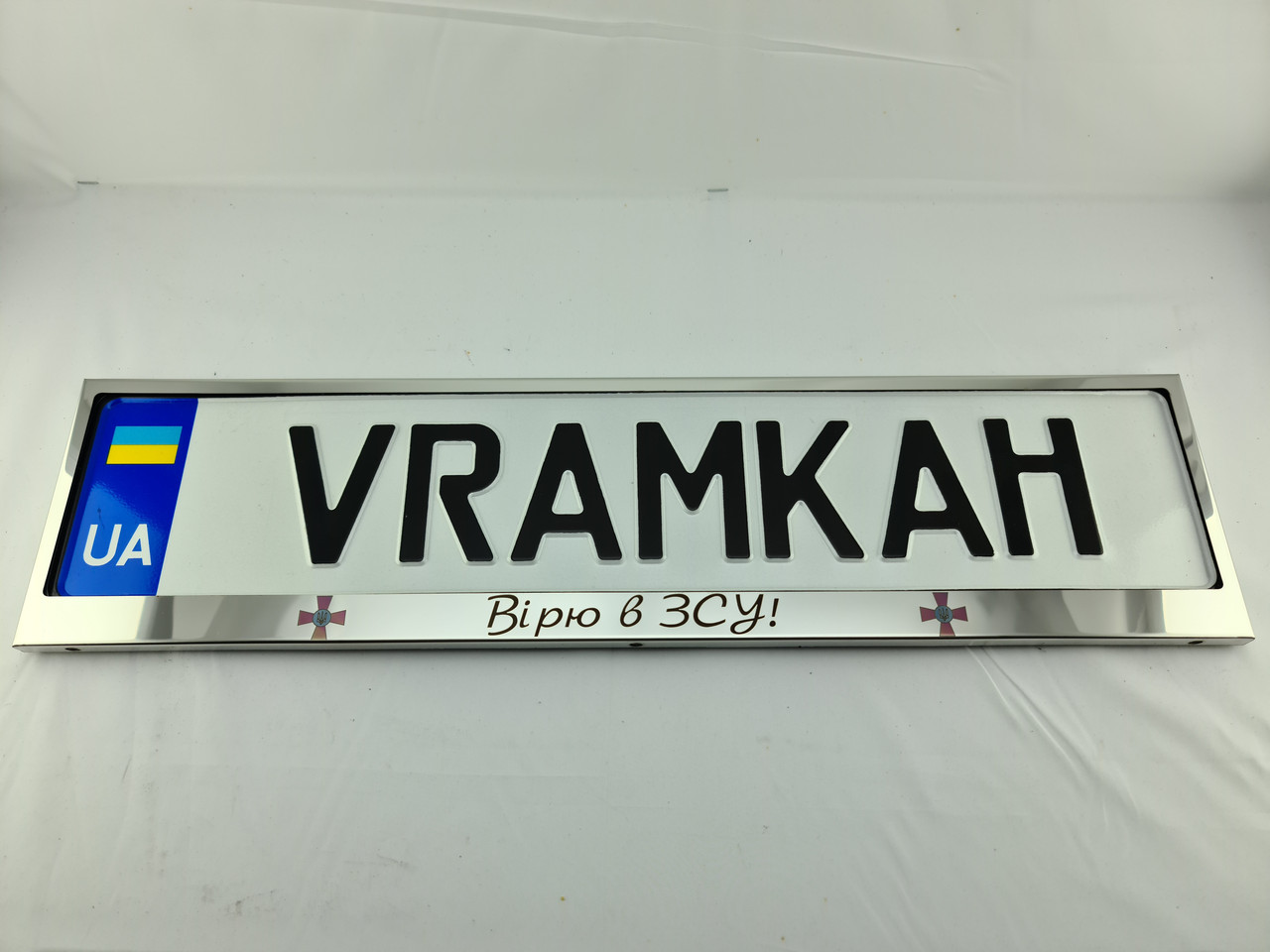 Номерна рамка під європейський номер розміром 114х522мм з лазерним гравіруванням написи "Вірю в ЗСУ!".