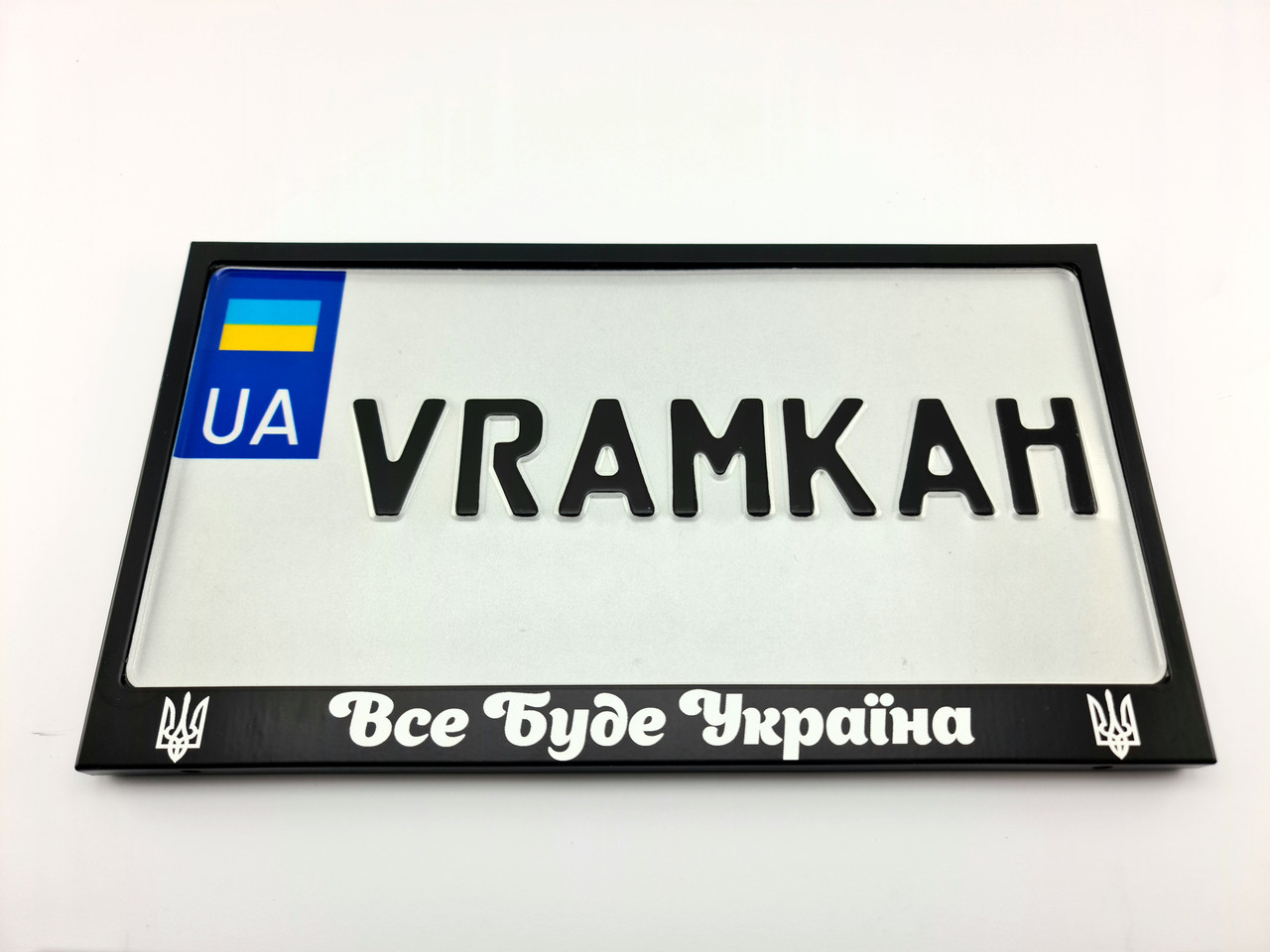 Напис Все Буде Україна і логотипи наноситься на рамку ультрафіолетовою печаткою, стійкою до природних впливів. Напис Все Буде Україна і логотипи не змивається і не стирається. Метал не прорізається, тому напис зроблений фірмовим шрифтом. Колір напису може бути будь-яким.