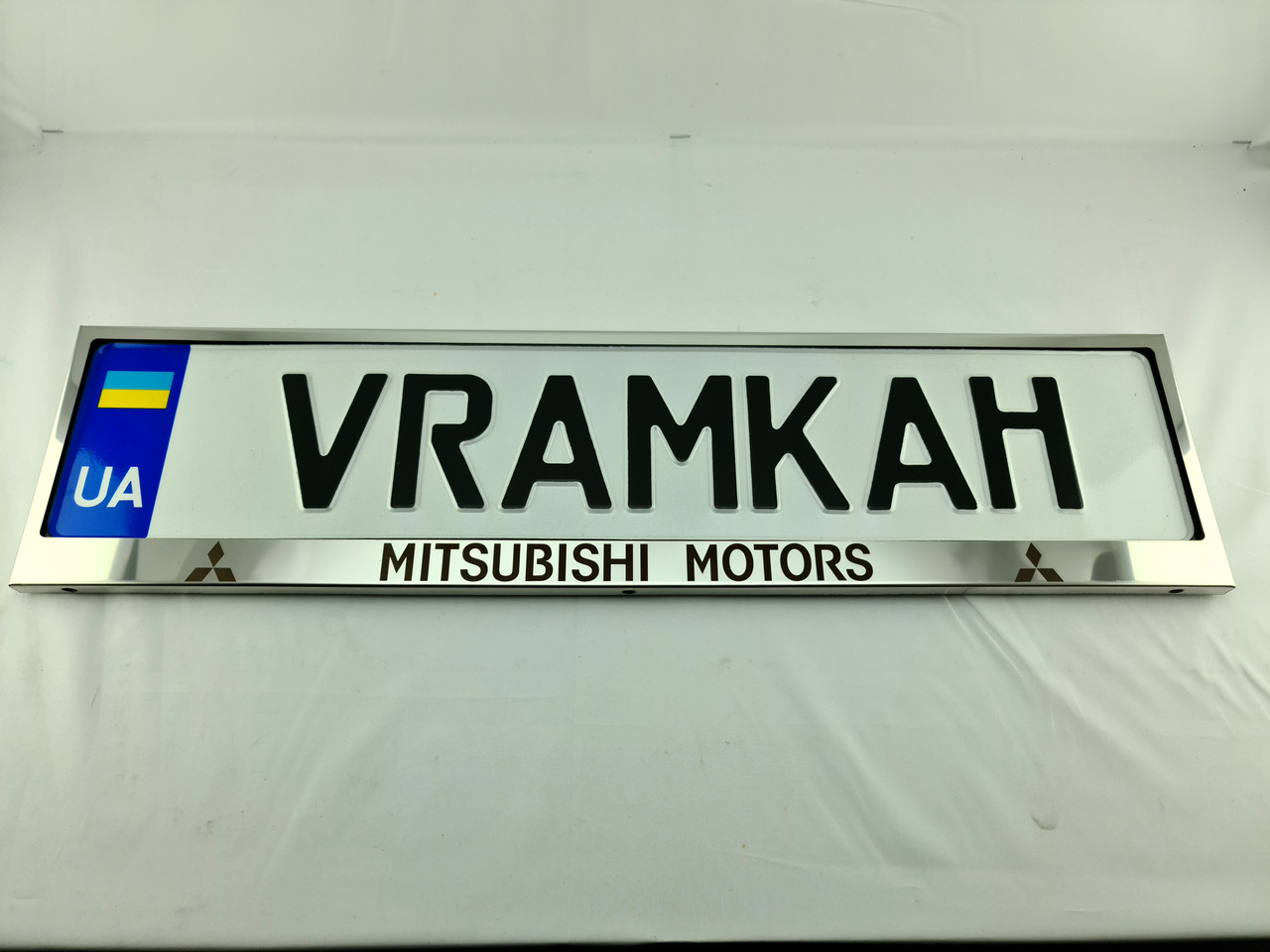 Чорна напис Mitsubishi Motors та логотипи наноситься на рамку лазерним гравіюванням, стійкою до природних впливів. Напис Mitsubishi Motors логотипи і не змивається і не стирається. Метал не прорізається, тому напис зроблений фірмовим шрифтом.